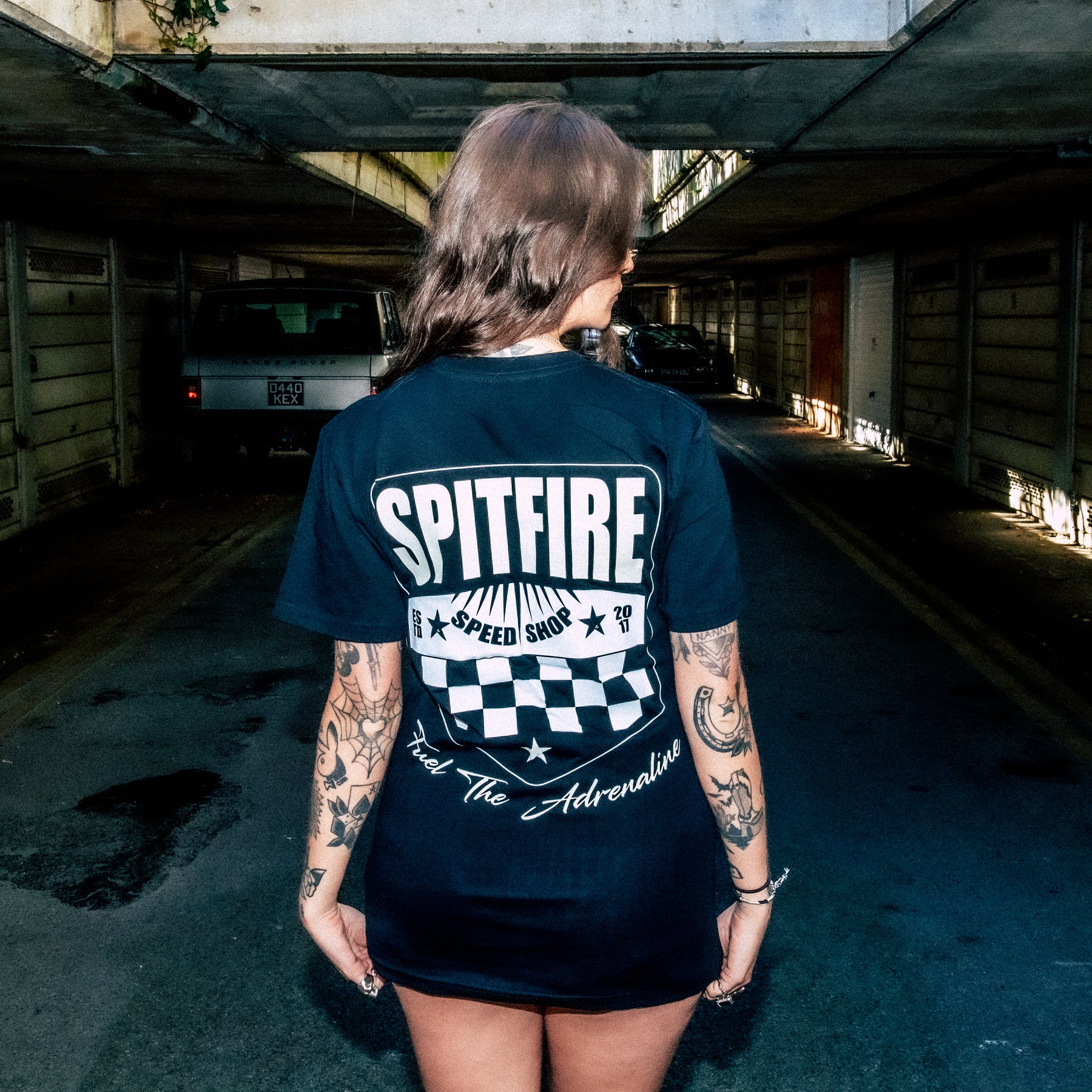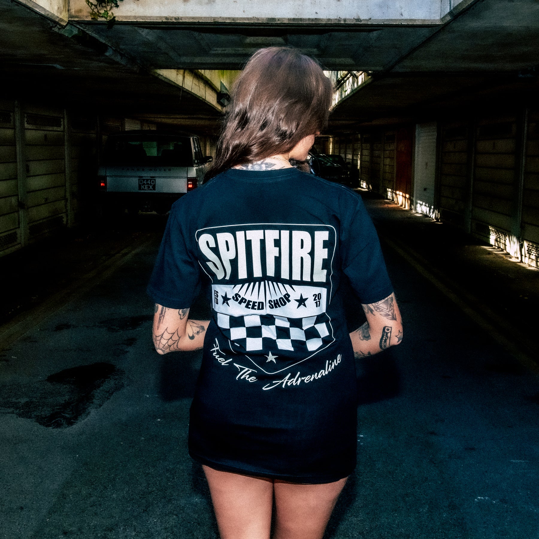 The Spitfire Speed Shop T-shirt in black has a large flag inspired logo on the back. Complete with the Fuel The Adrenaline detail underneath and small Spitfire Race logo on the front left.