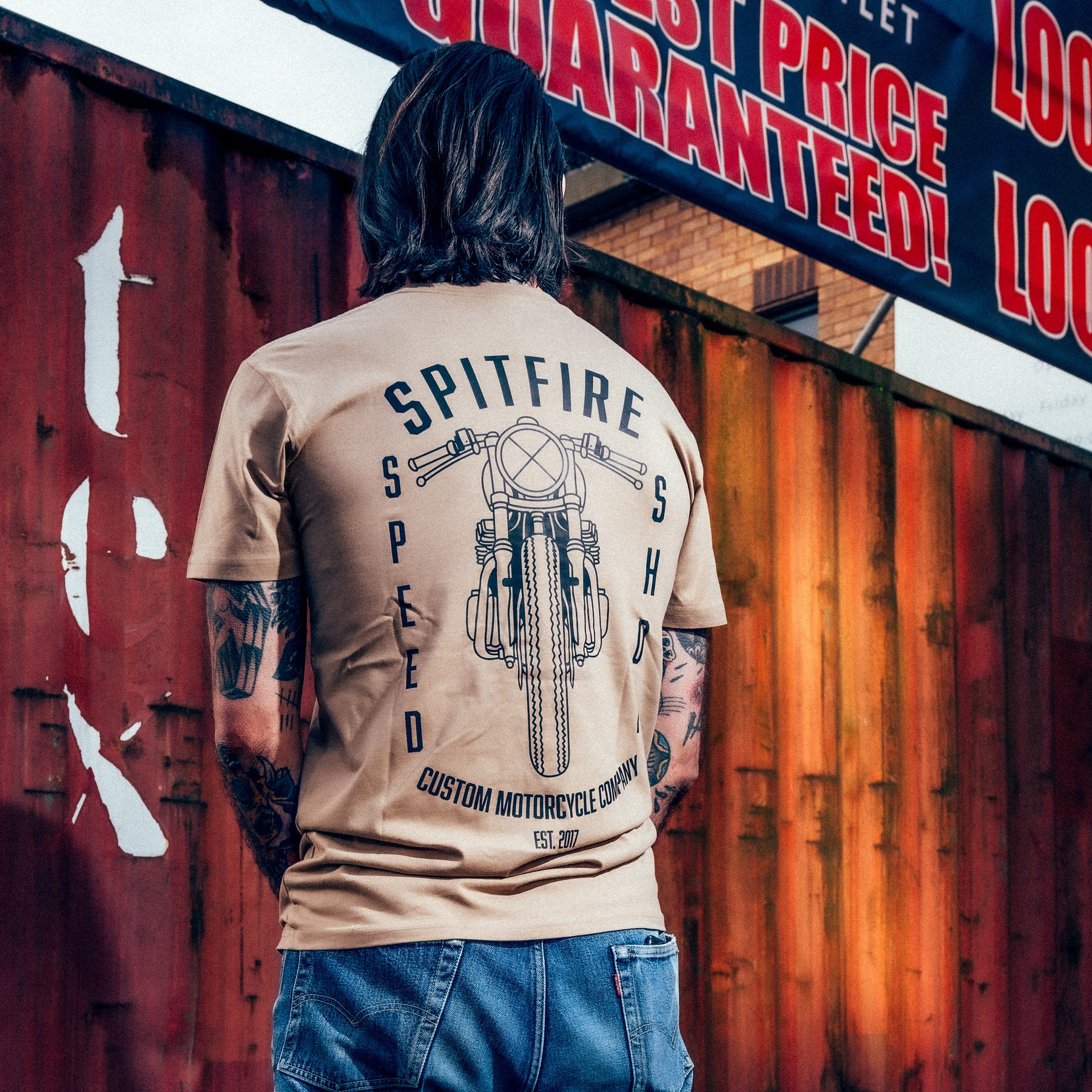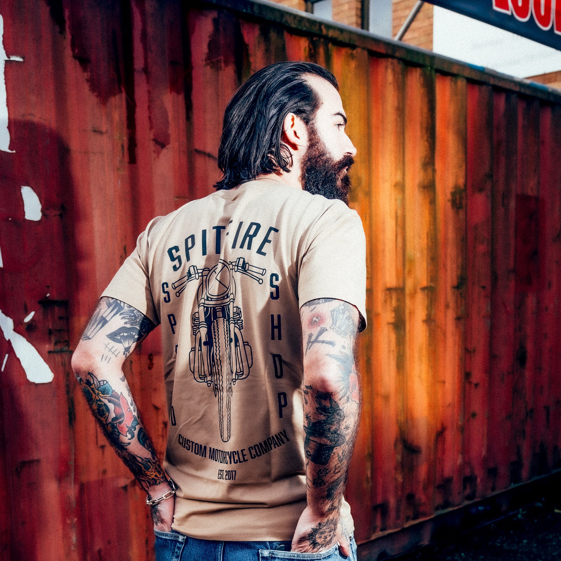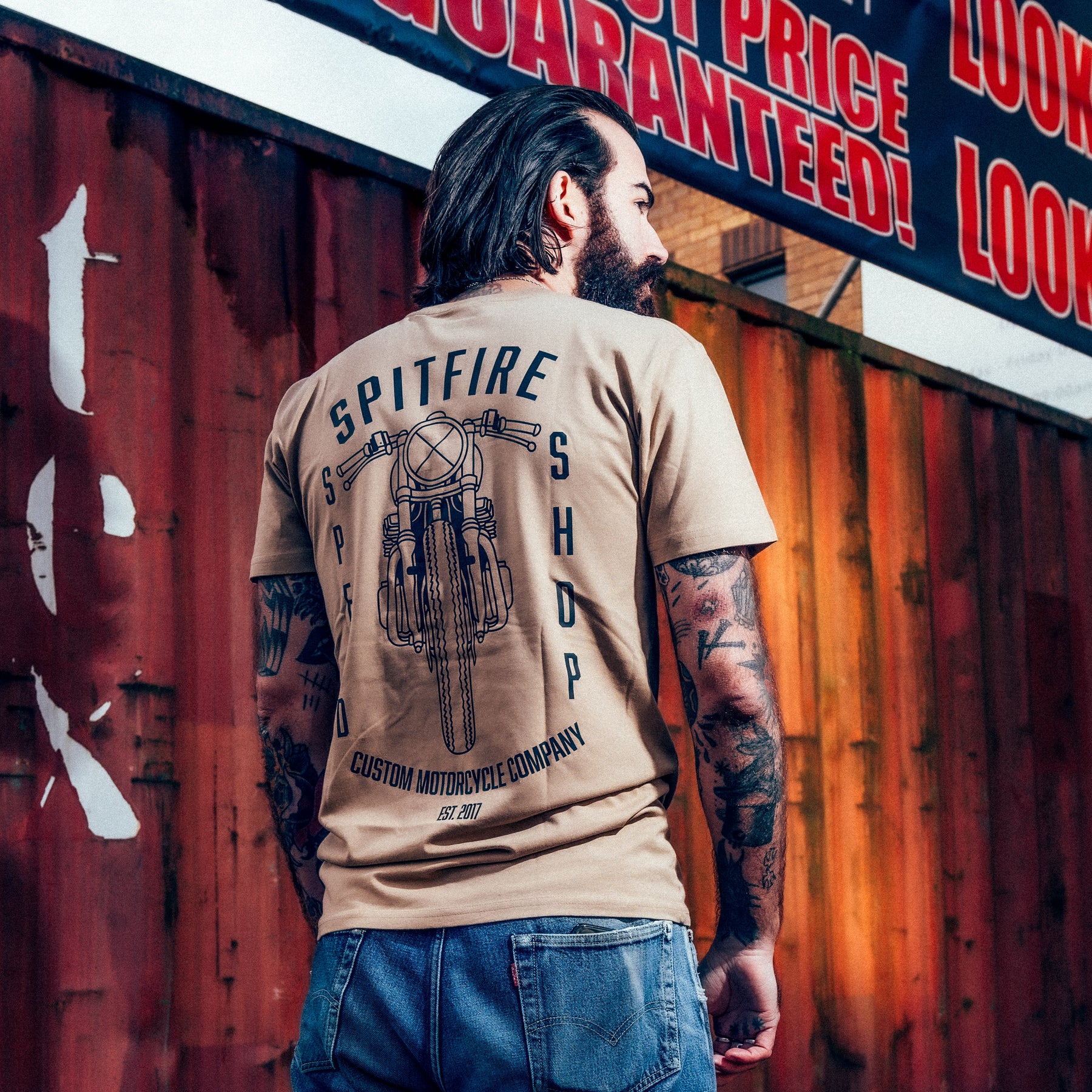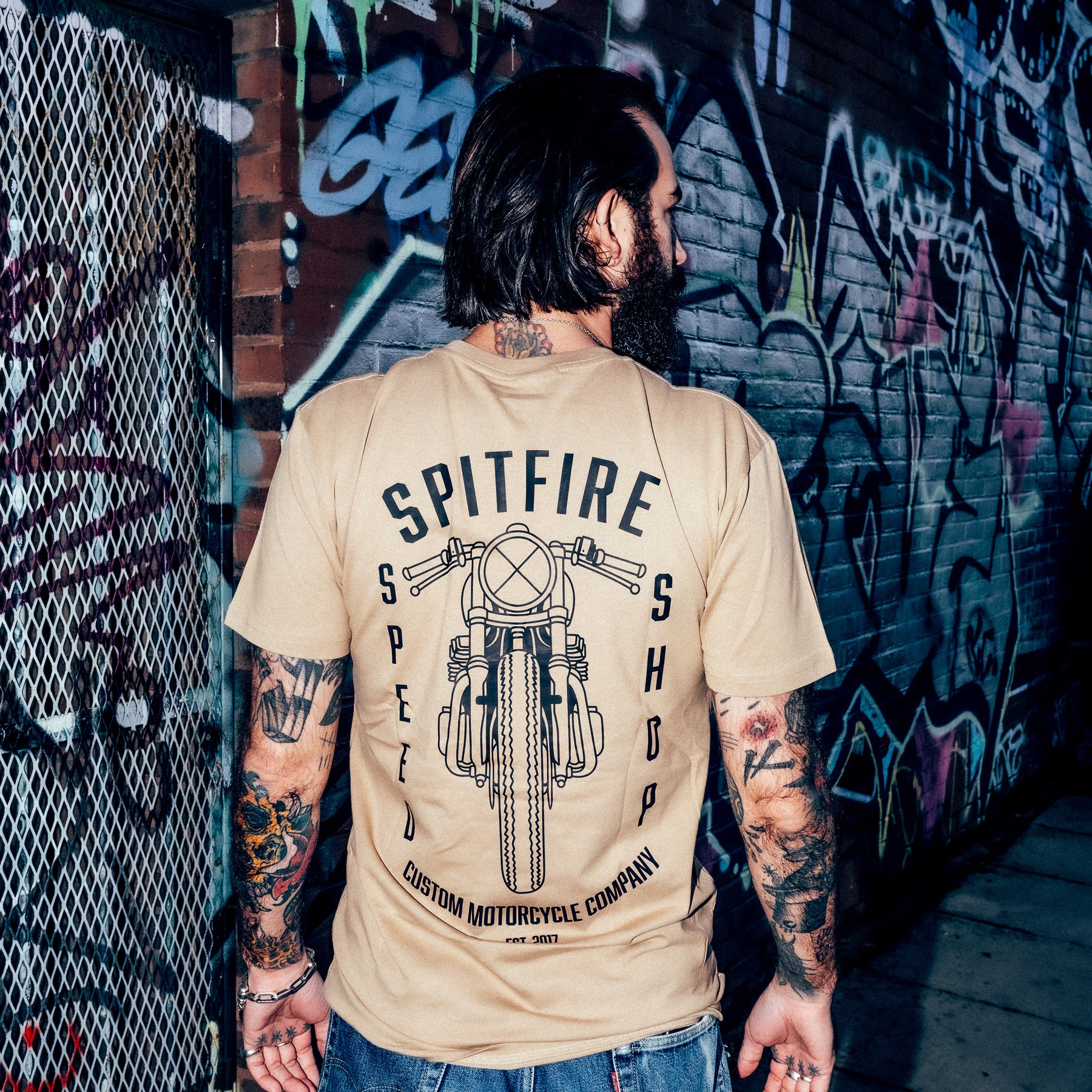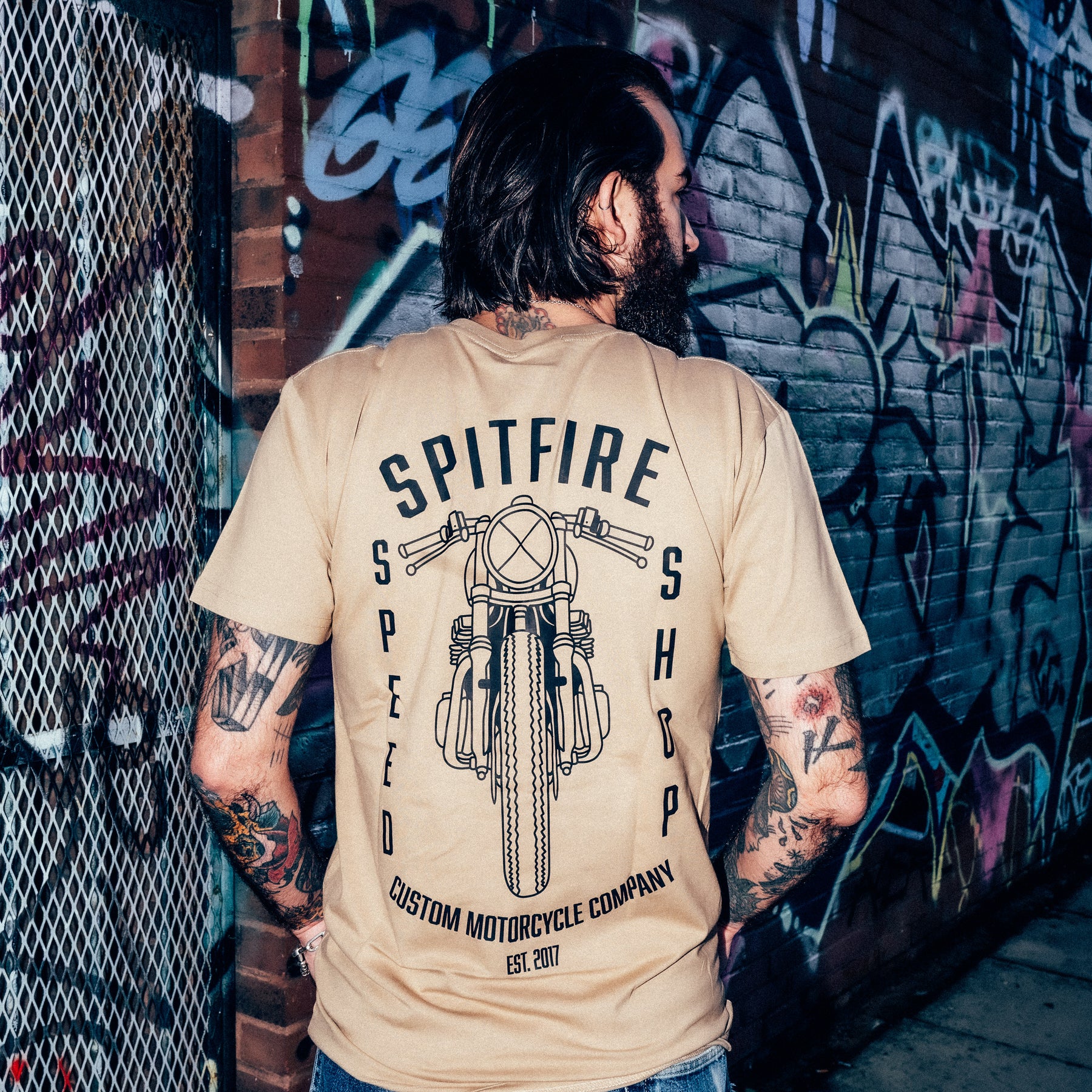 The new Spitfire Custom Motorcycle Company sand coloured T-Shirt with black logo. Slide into a T-Shirt that feels like open roads and loud engines. Crafted for those who live on two wheels, this custom moto T-Shirt blends rugged style with all-day comfort.