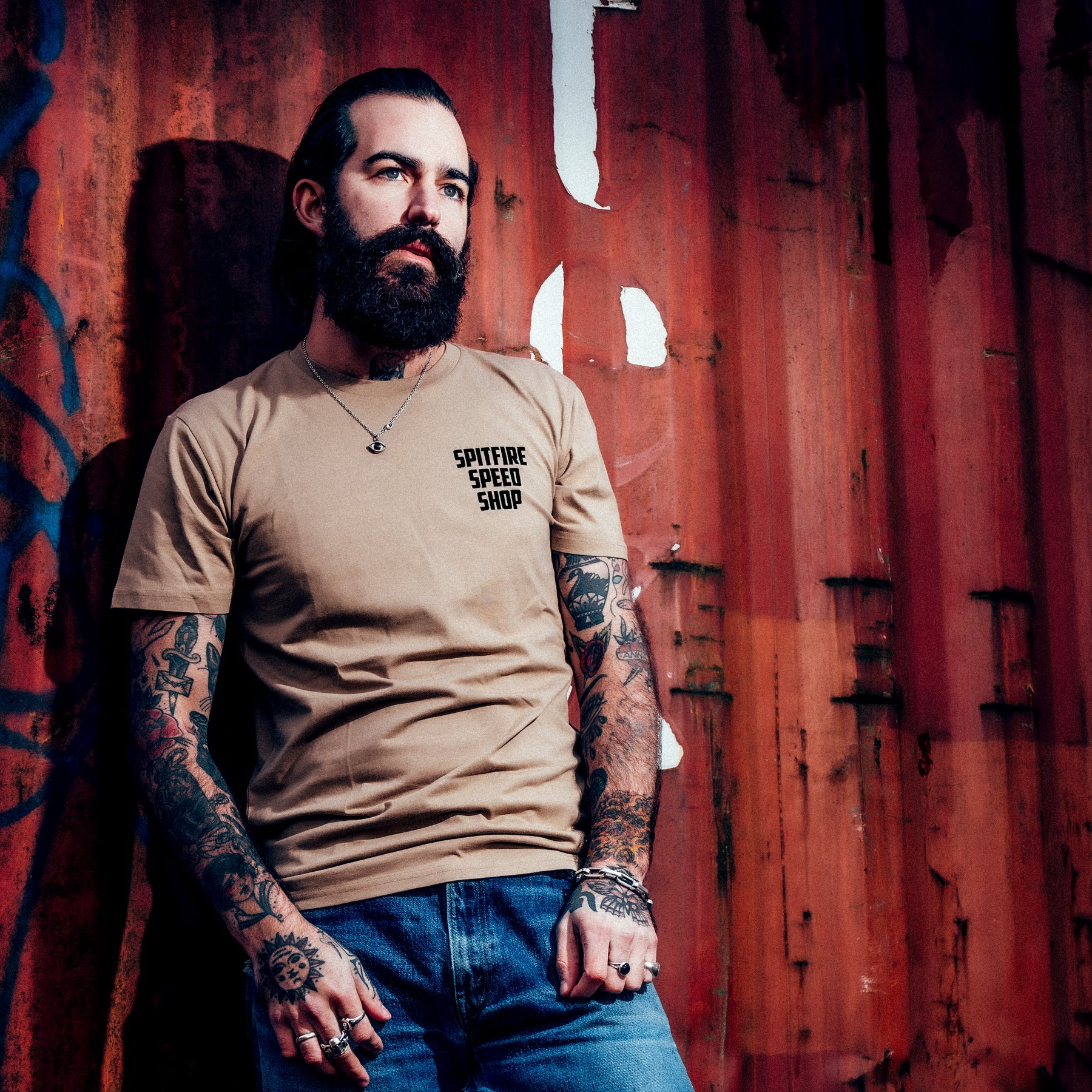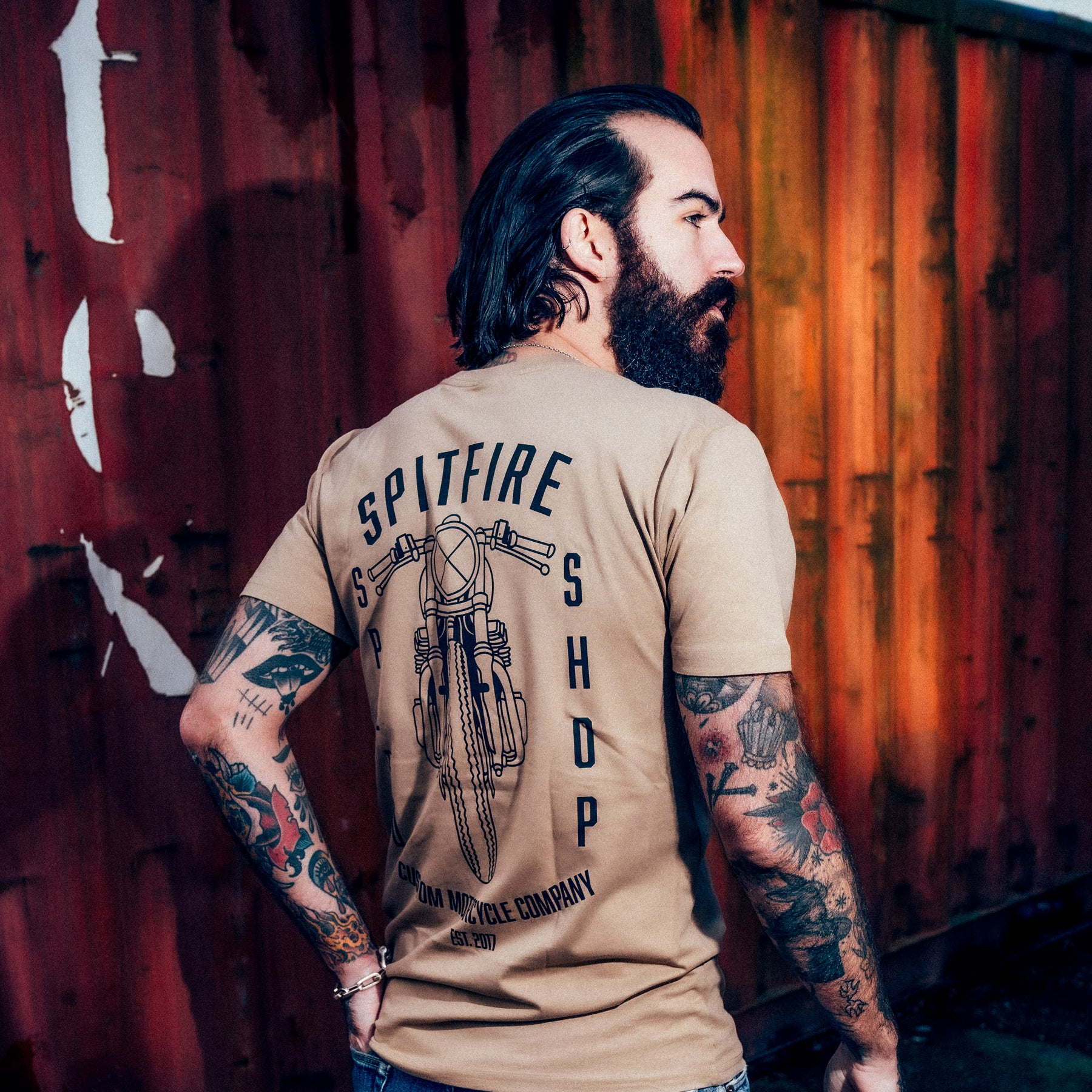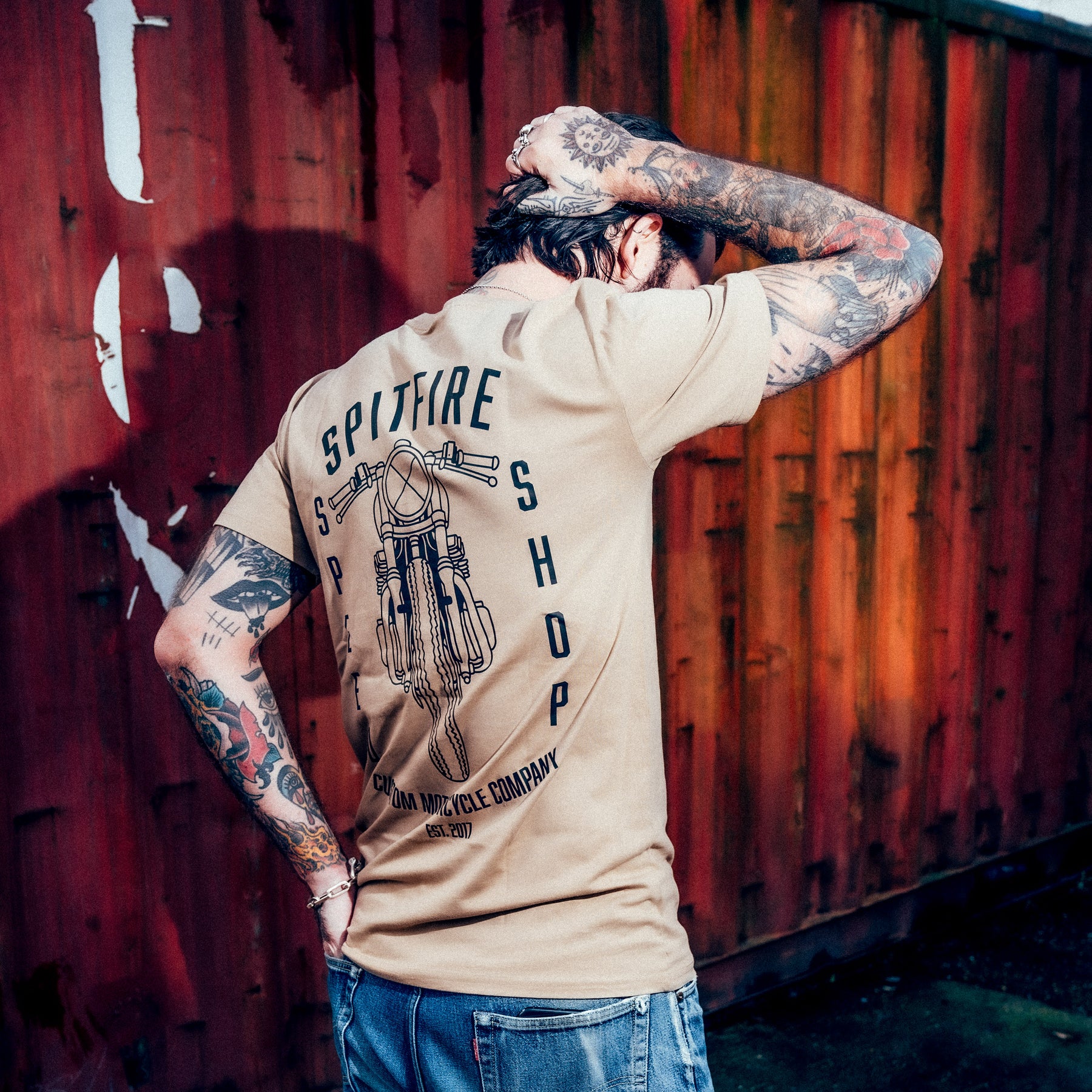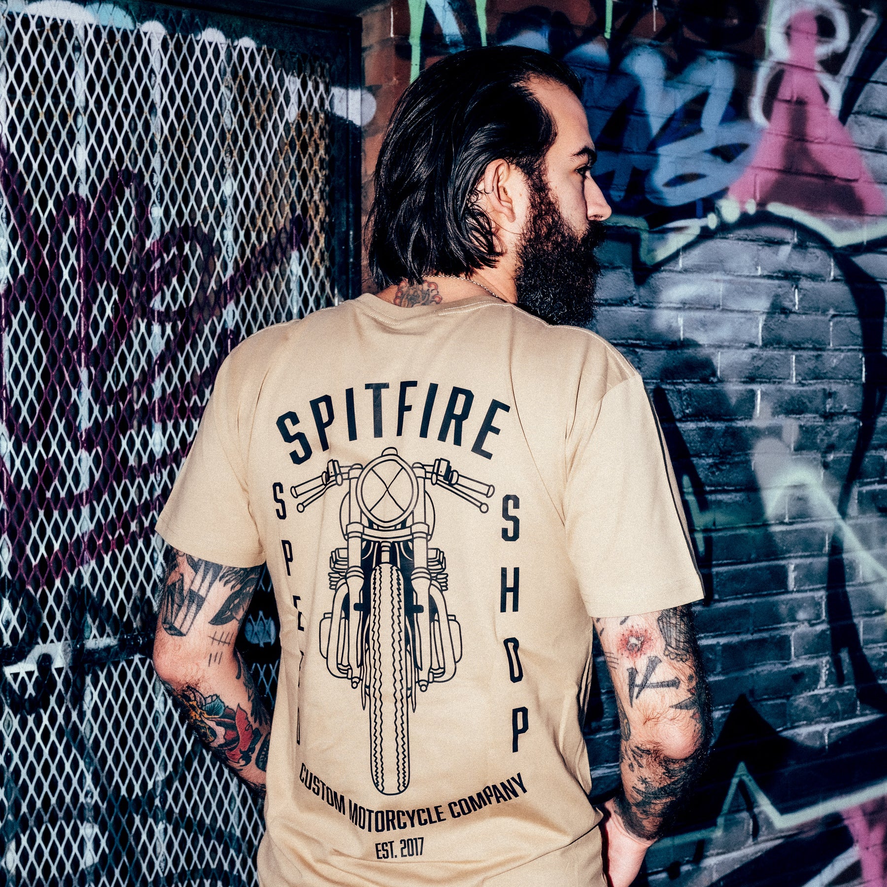 The new Spitfire Custom Motorcycle Company sand coloured T-Shirt with black logo. Slide into a T-Shirt that feels like open roads and loud engines. Crafted for those who live on two wheels, this custom moto T-Shirt blends rugged style with all-day comfort.