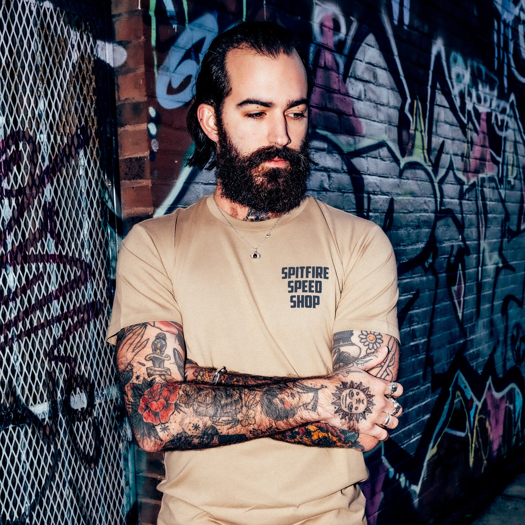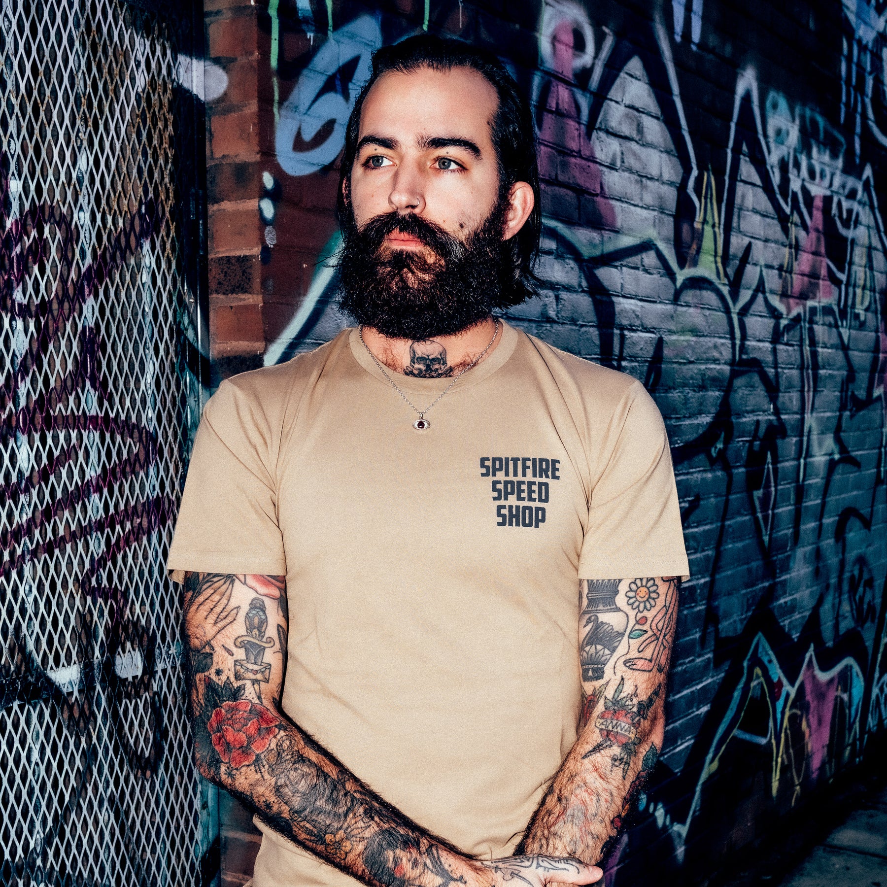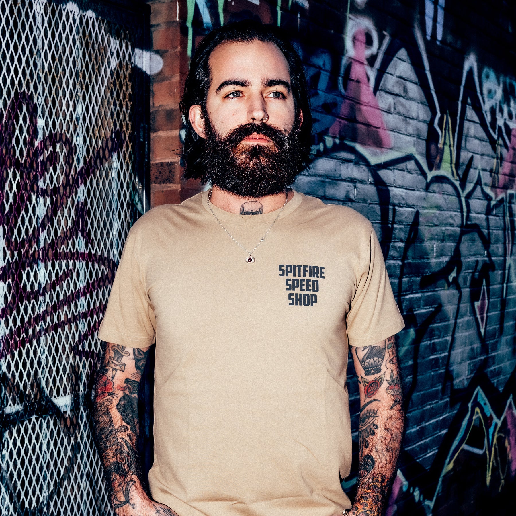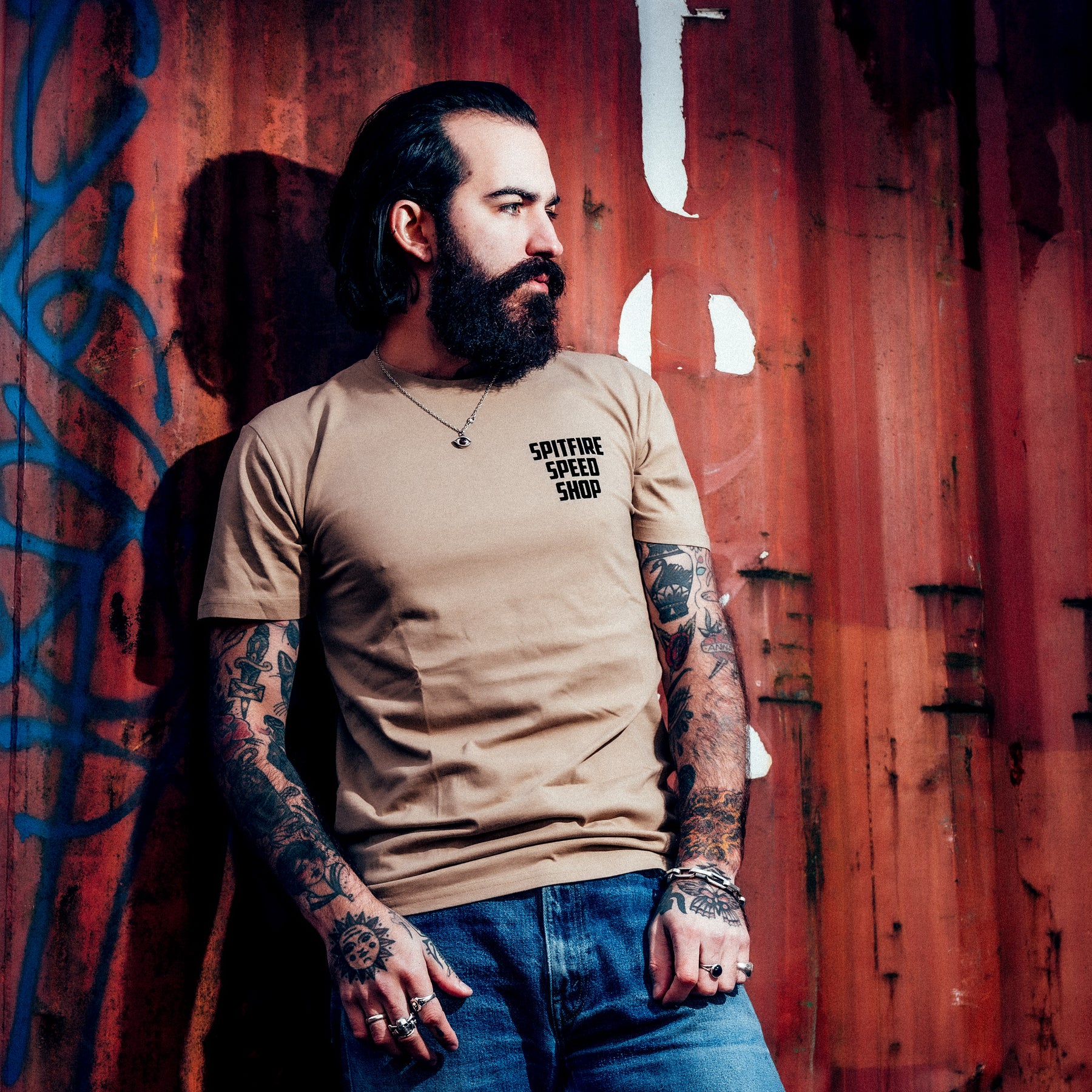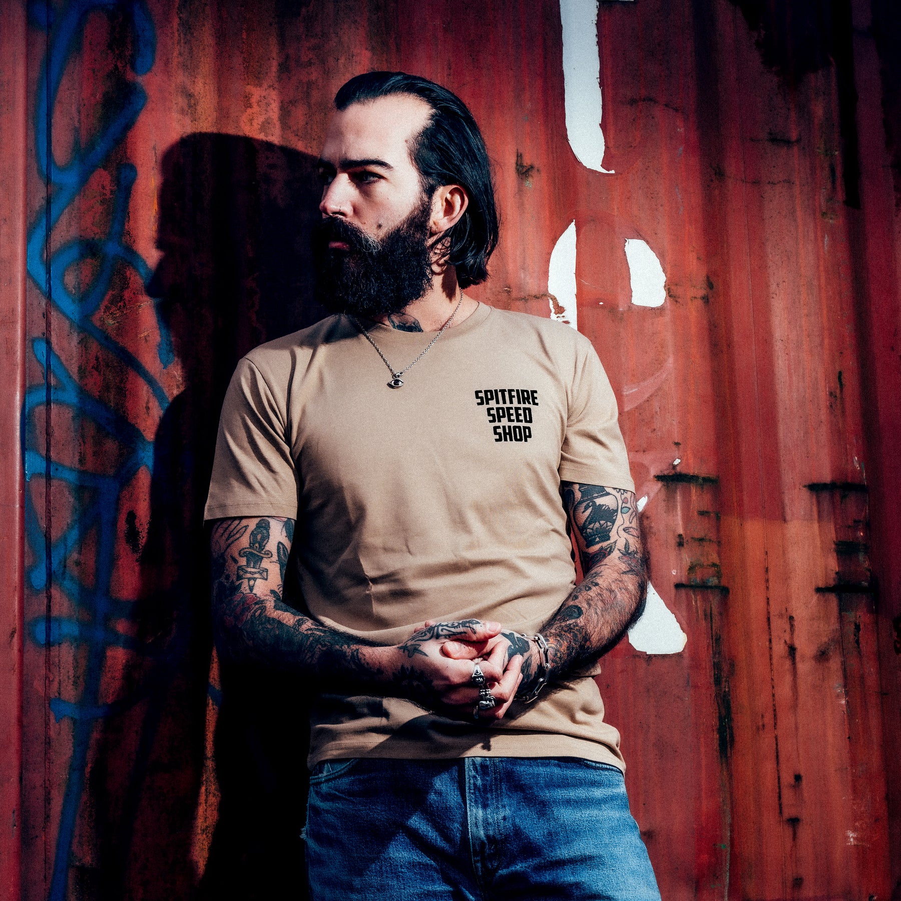 The new Spitfire Custom Motorcycle Company sand coloured T-Shirt with black logo. Slide into a T-Shirt that feels like open roads and loud engines. Crafted for those who live on two wheels, this custom moto T-Shirt blends rugged style with all-day comfort.