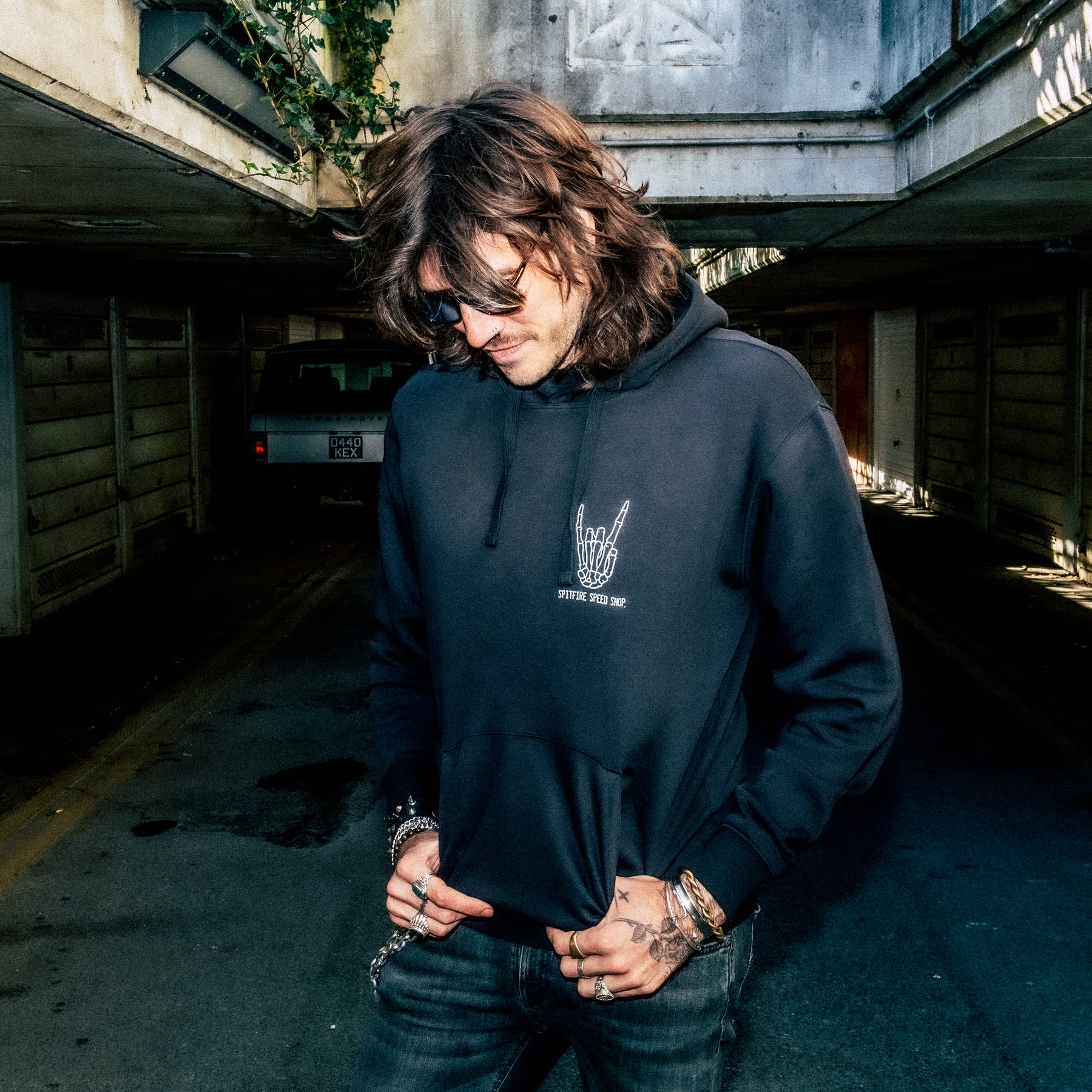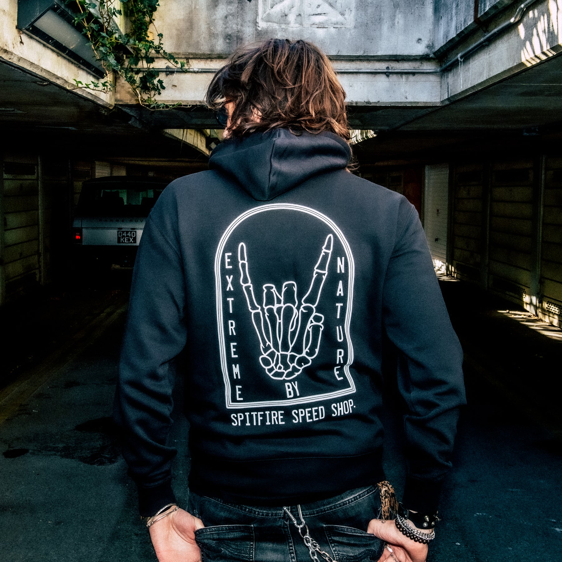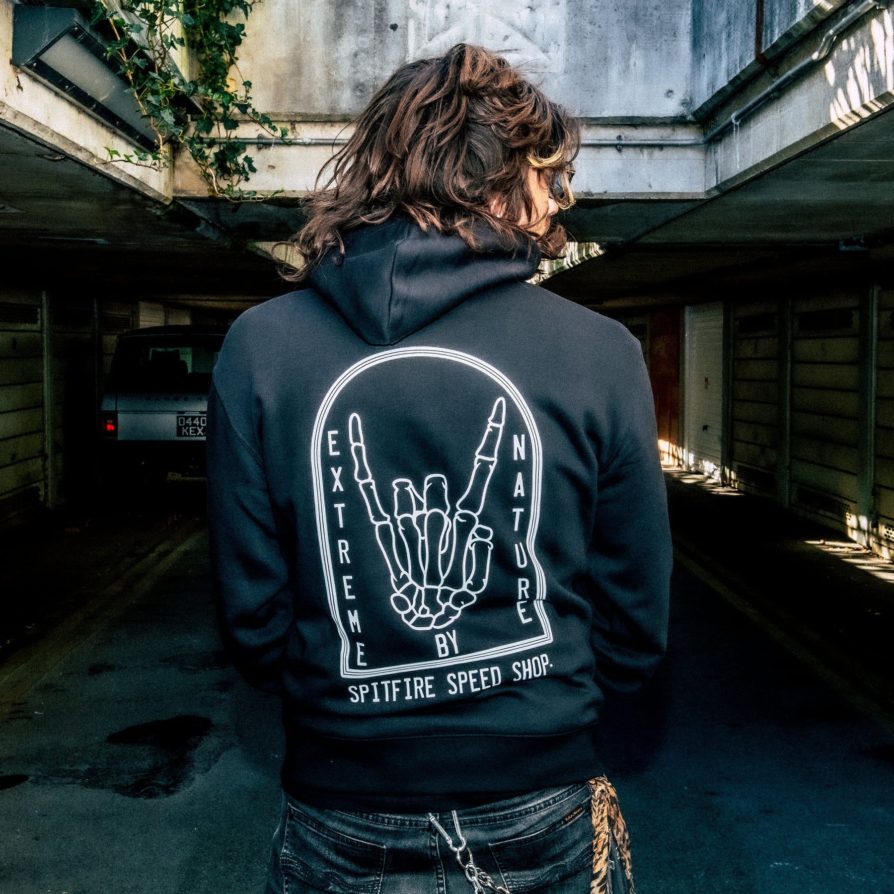 Born for the wild ones. The Extreme By Nature hoodie is a straight-up statement piece — featuring our iconic skeletal rock hand design. Built for those who live loud, ride harder, and never tone it down.