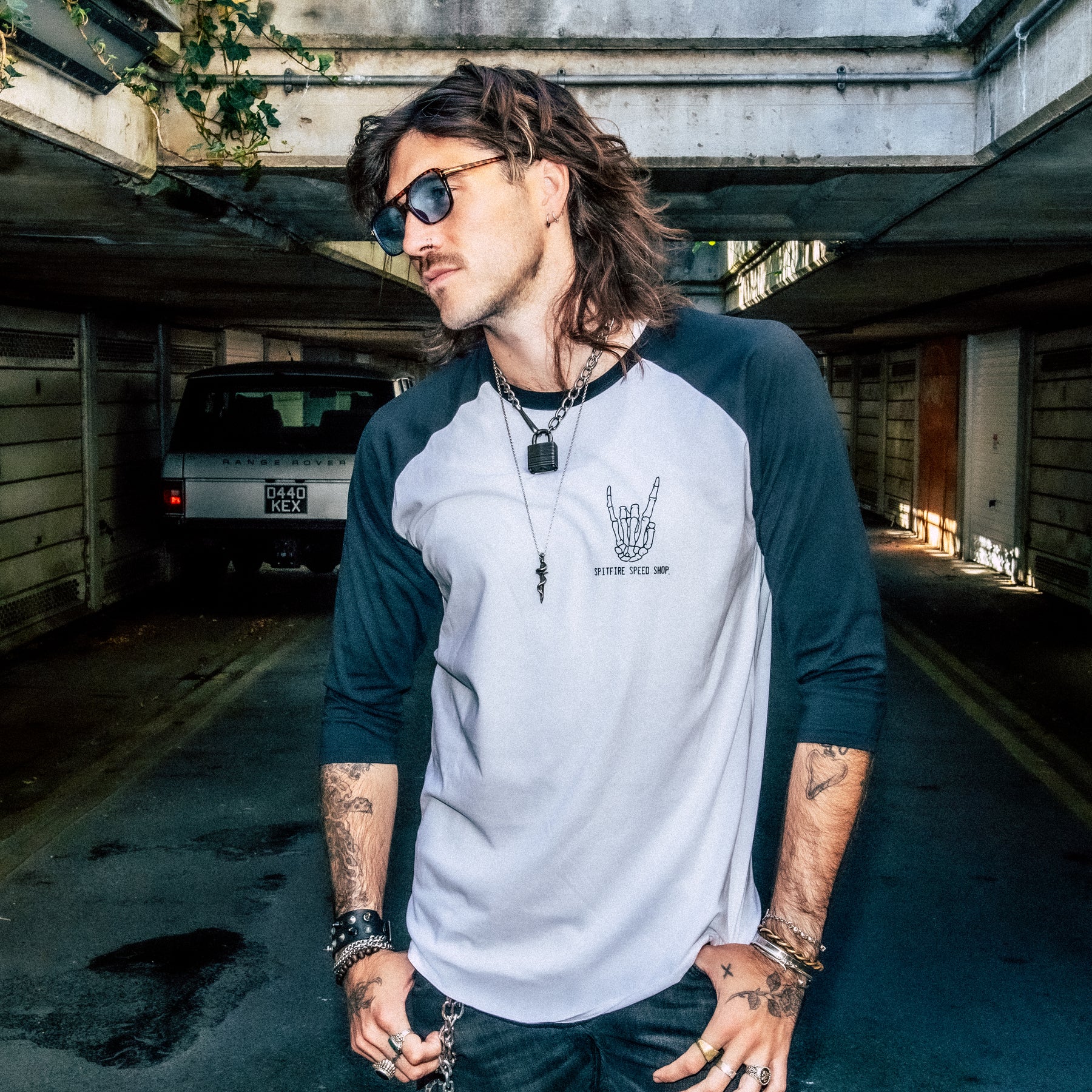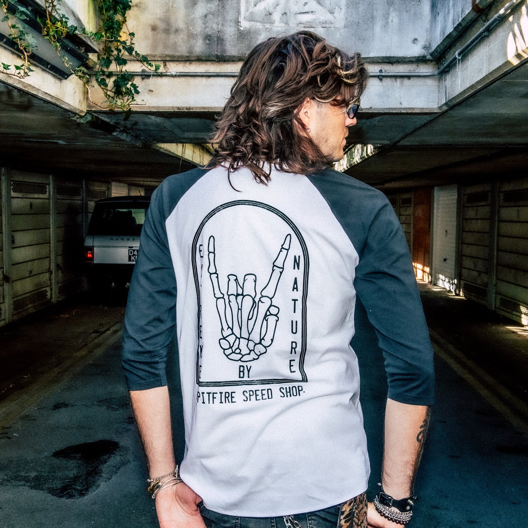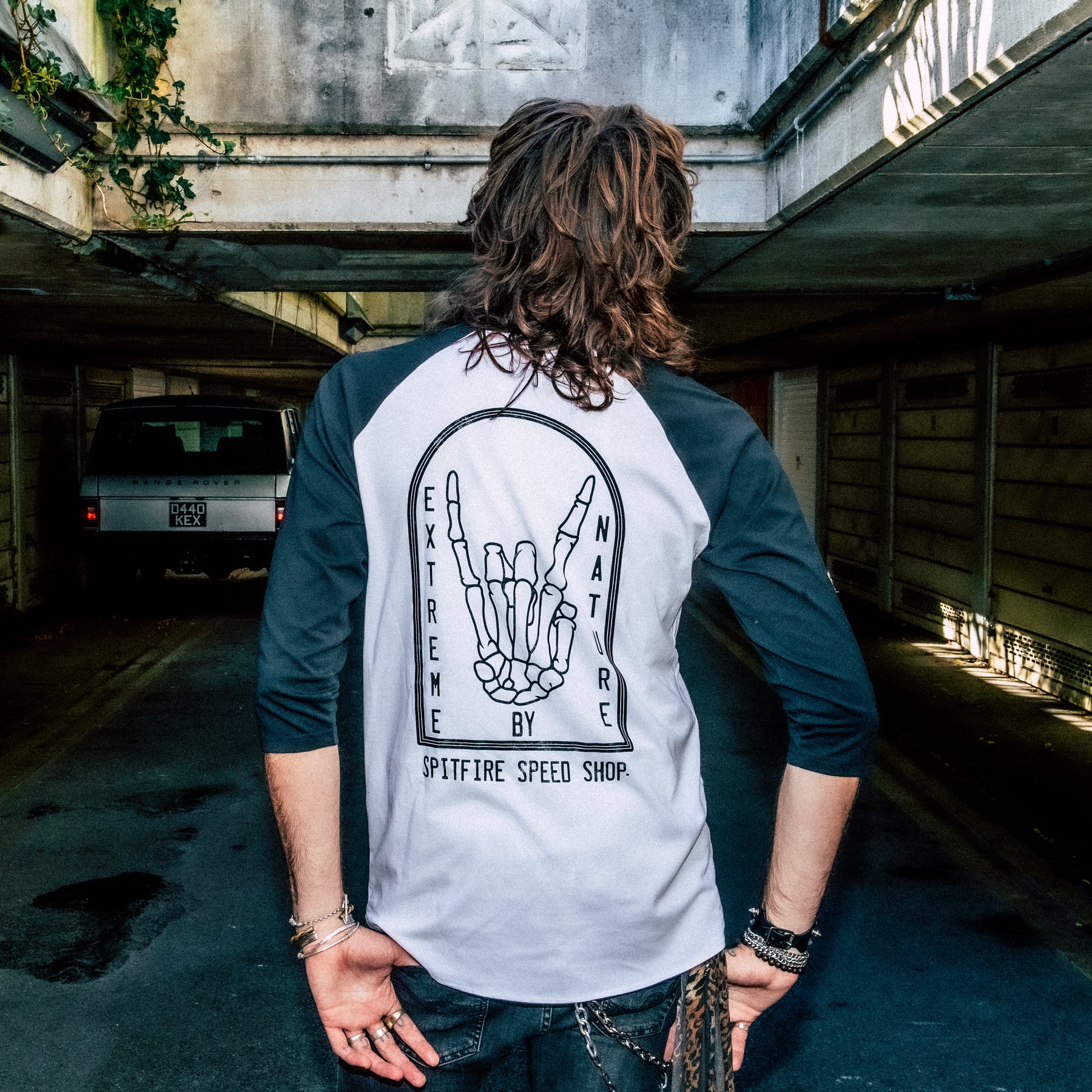 Born for the wild ones. The Extreme By Nature baseball t-shirt is a straight-up statement piece — featuring our iconic skeletal rock hand design. Built for those who live loud, ride harder, and never tone it down.