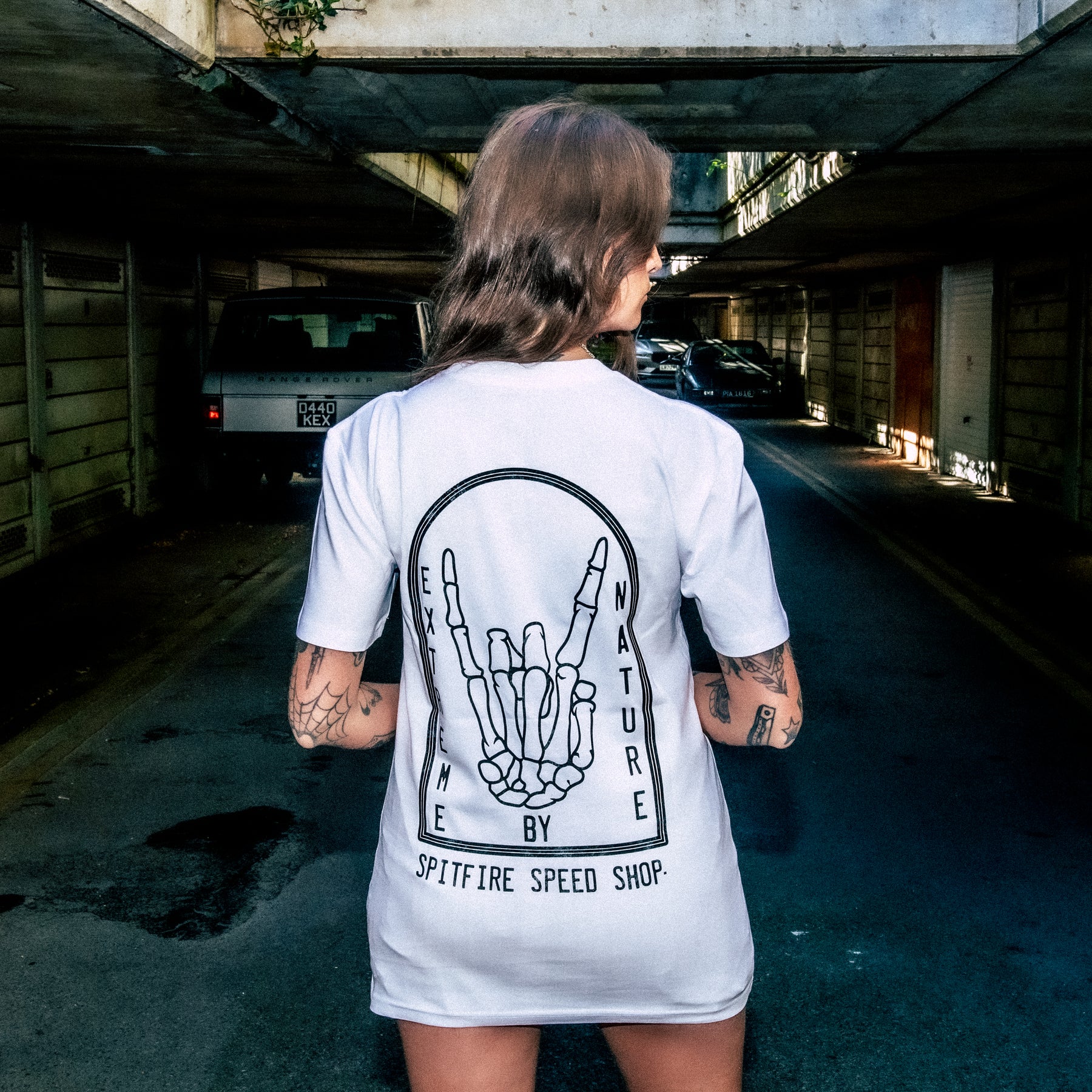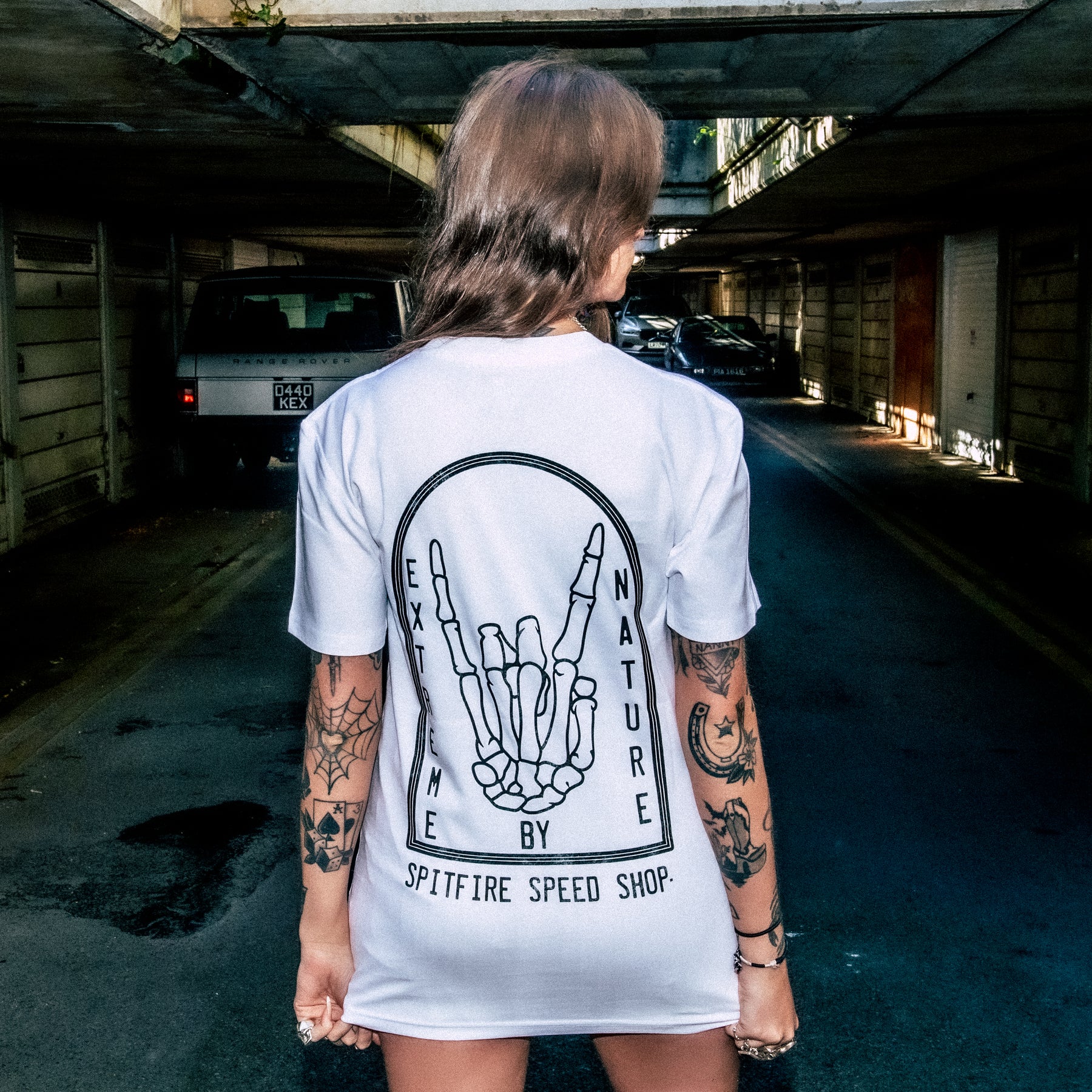 Born for the wild ones. The Extreme By Nature t-shirt is a straight-up statement piece — featuring our iconic skeletal rock hand design. Built for those who live loud, ride harder, and never tone it down.