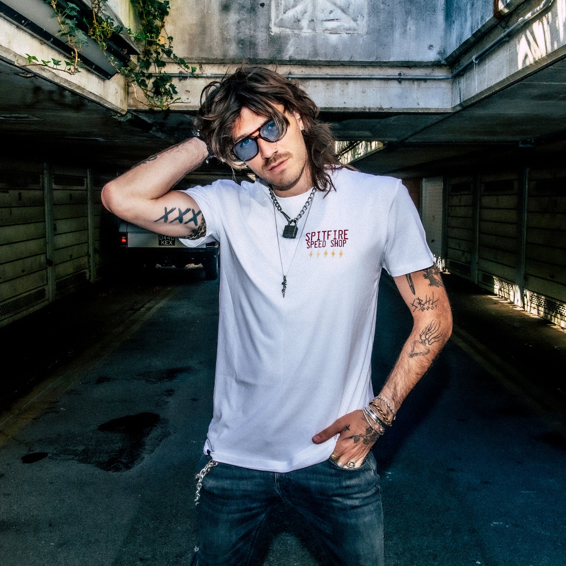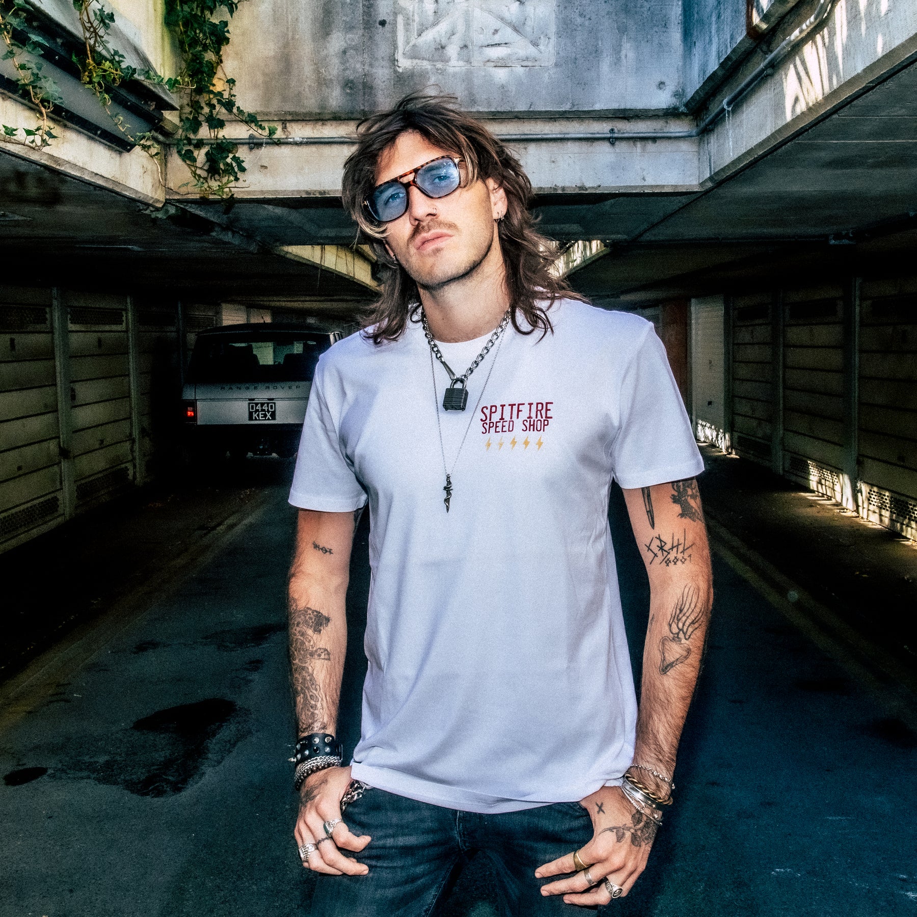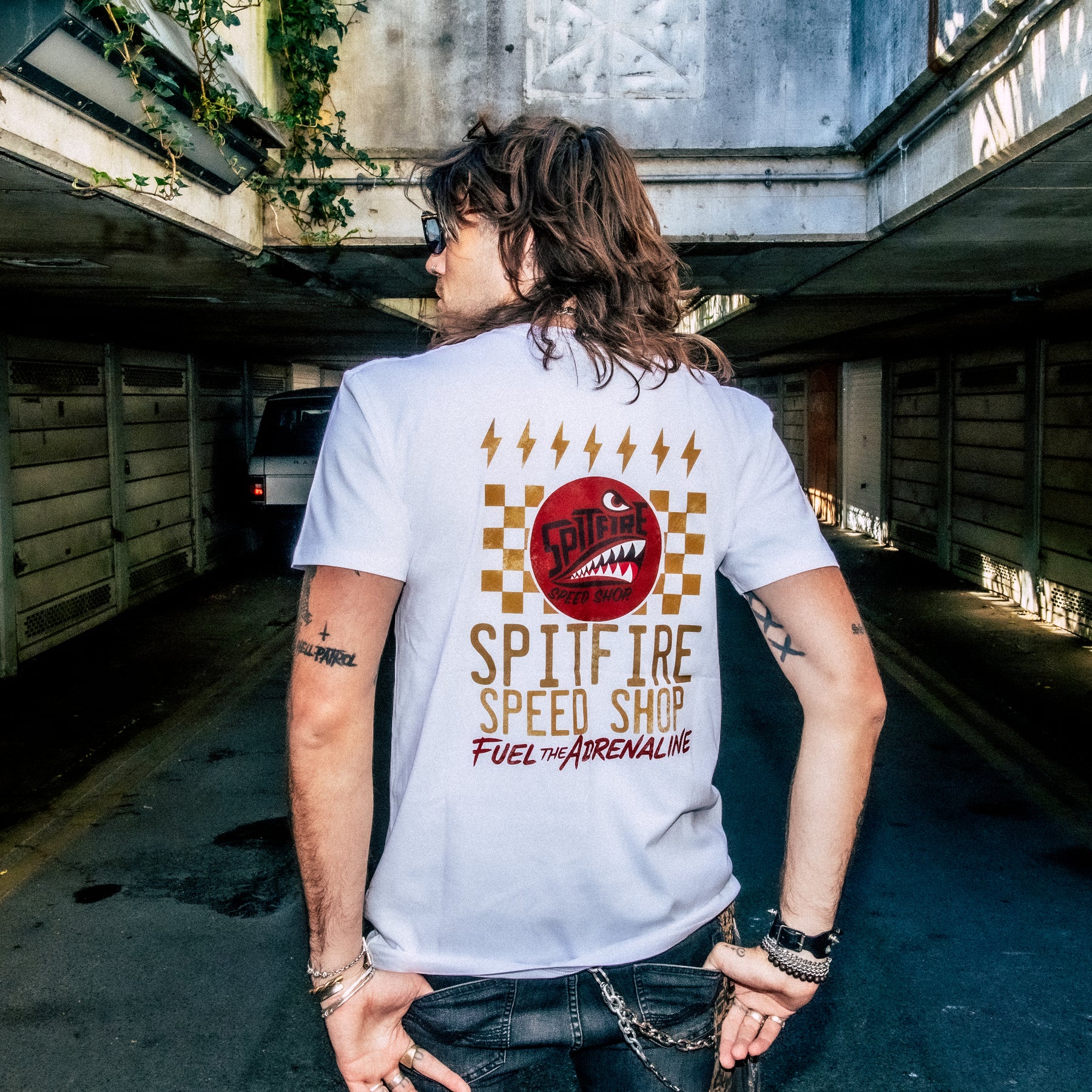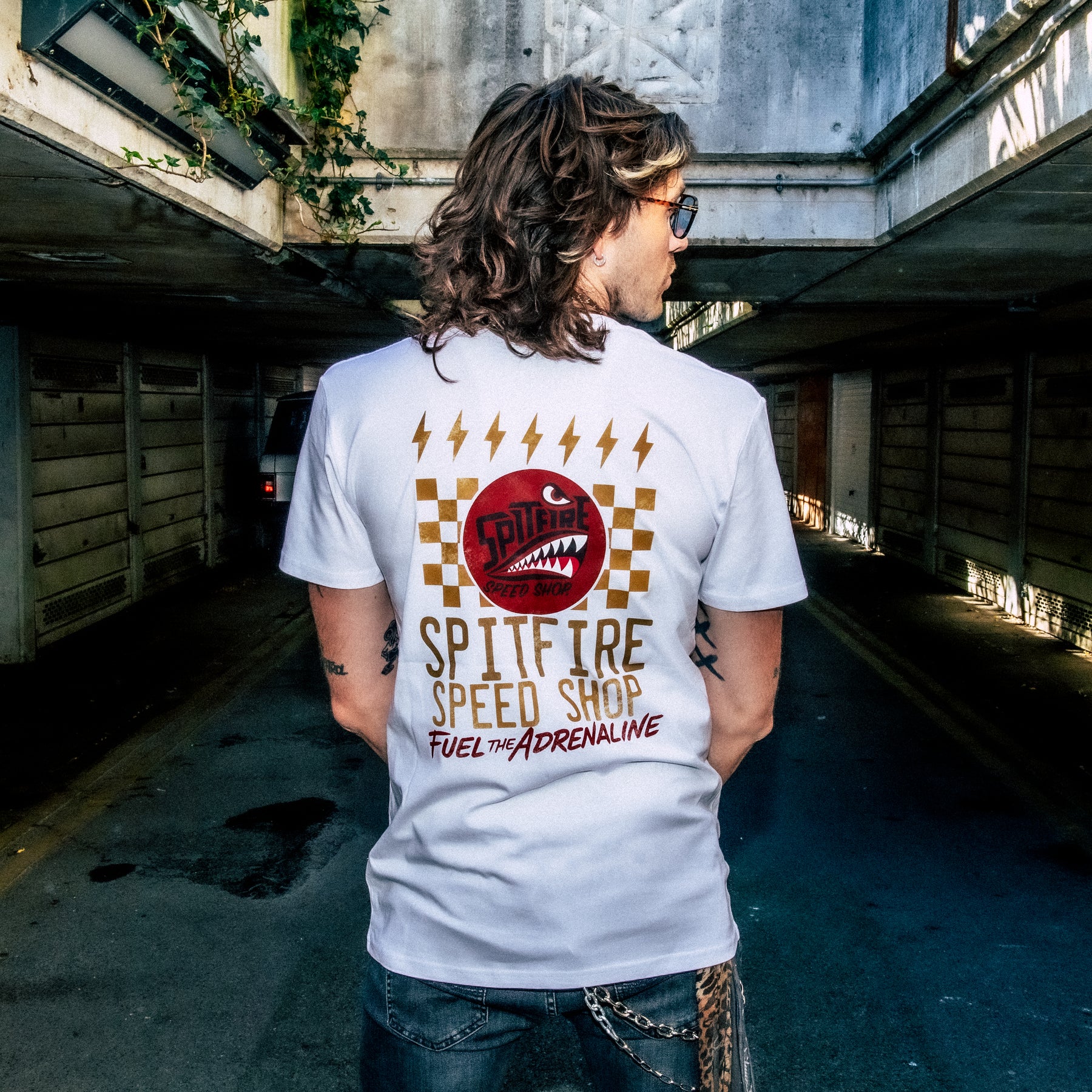White Spitfire Fuel The Adrenaline T-Shirt With Full Colour Logo – Spitfire Speed Shop