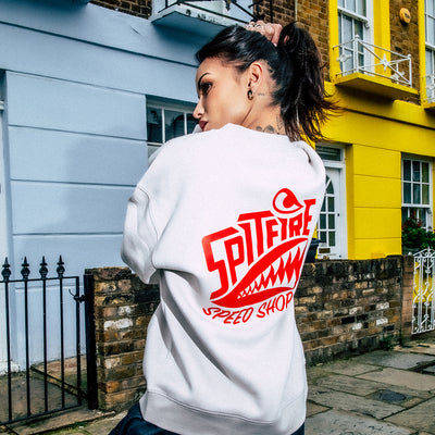 Easy dressing with the standout Spitfire Speed Shop Bone White Crew Sweatshirt with Red Spitfire Logos. Designed for everyday wear, this mid-heavy weight sweatshirt features a regular fit and is made from 80% cotton and 20% recycled polyester anti-pill fleece. With inset sleeves and ribbed cuffs, it's pre-shrunk to ensure long-lasting quality and fit.