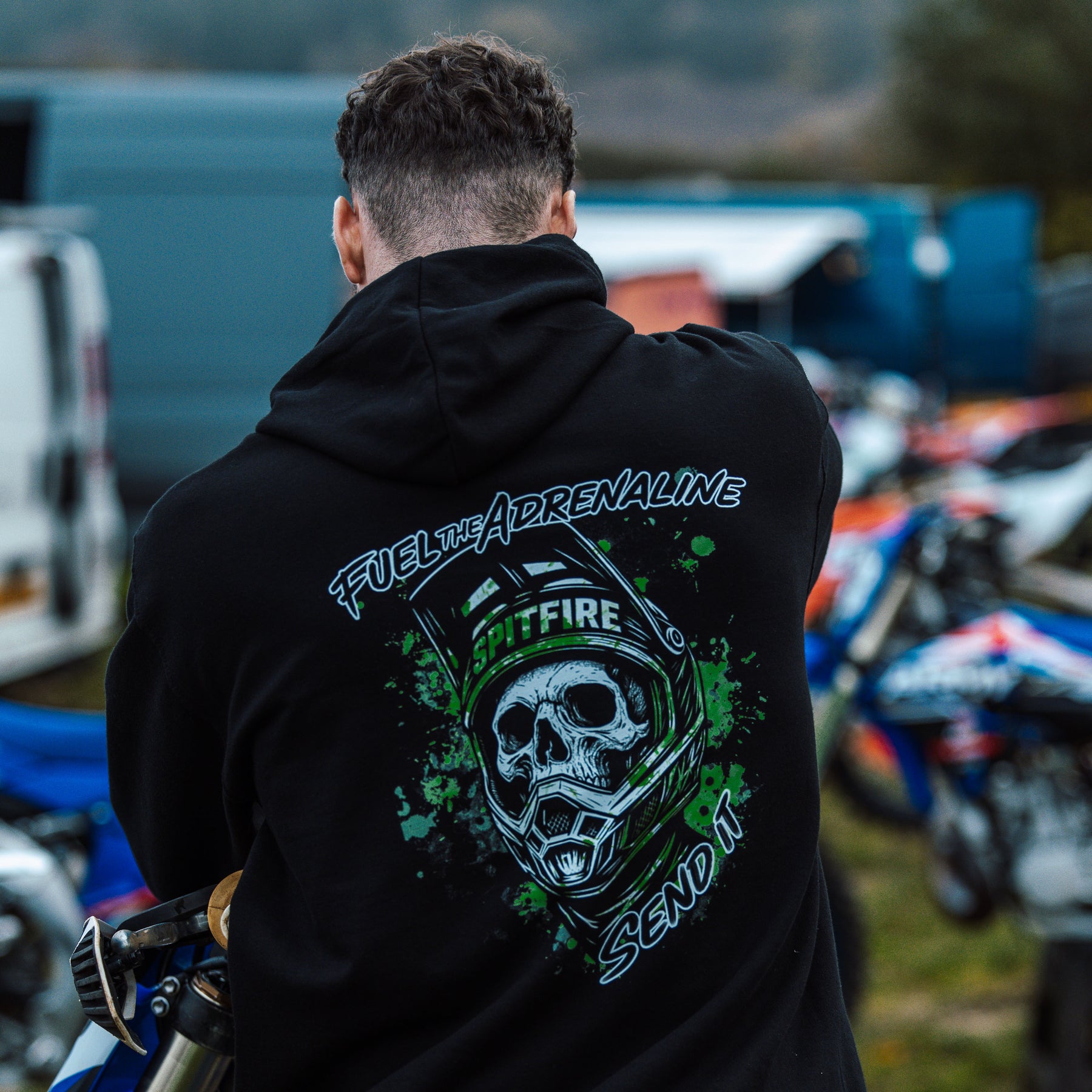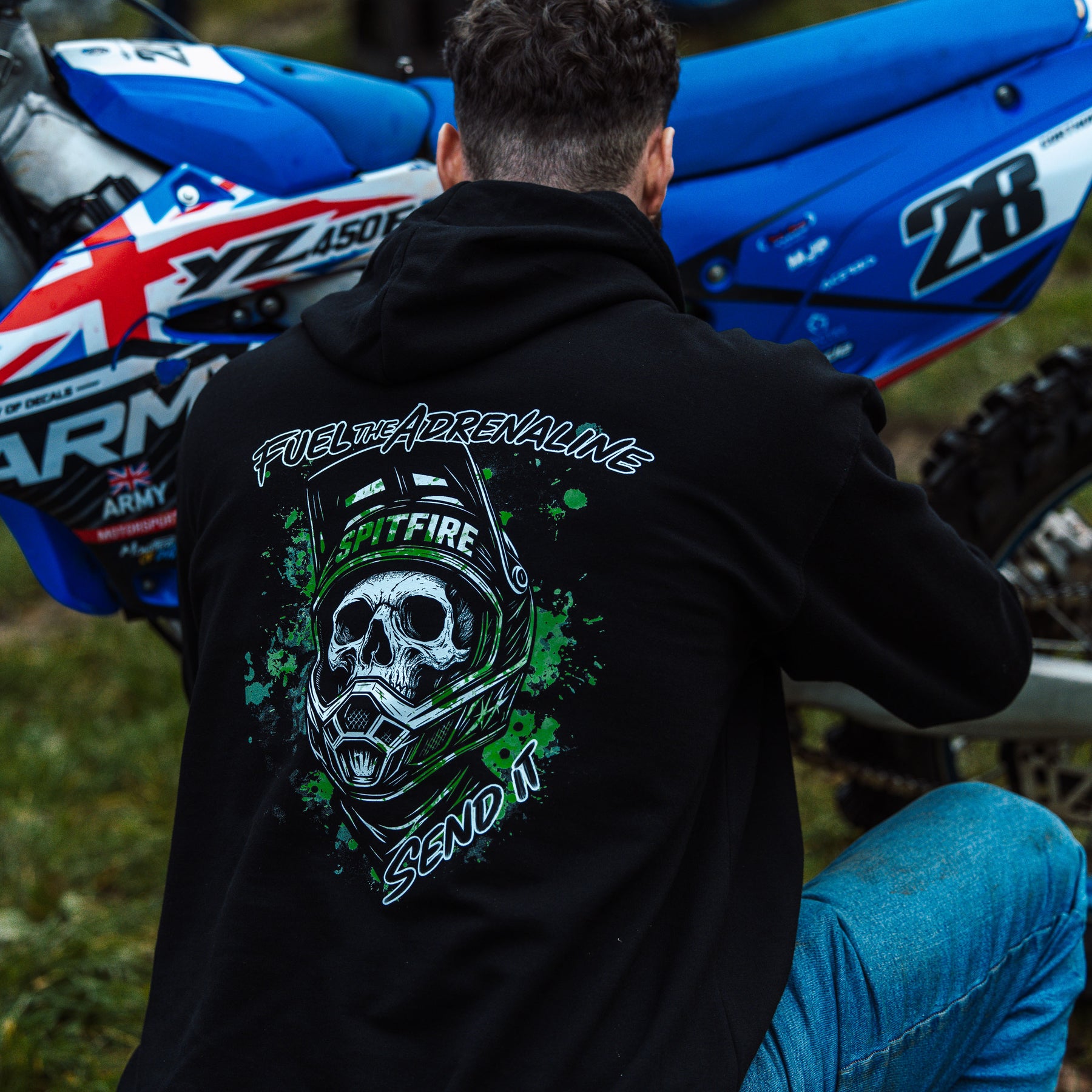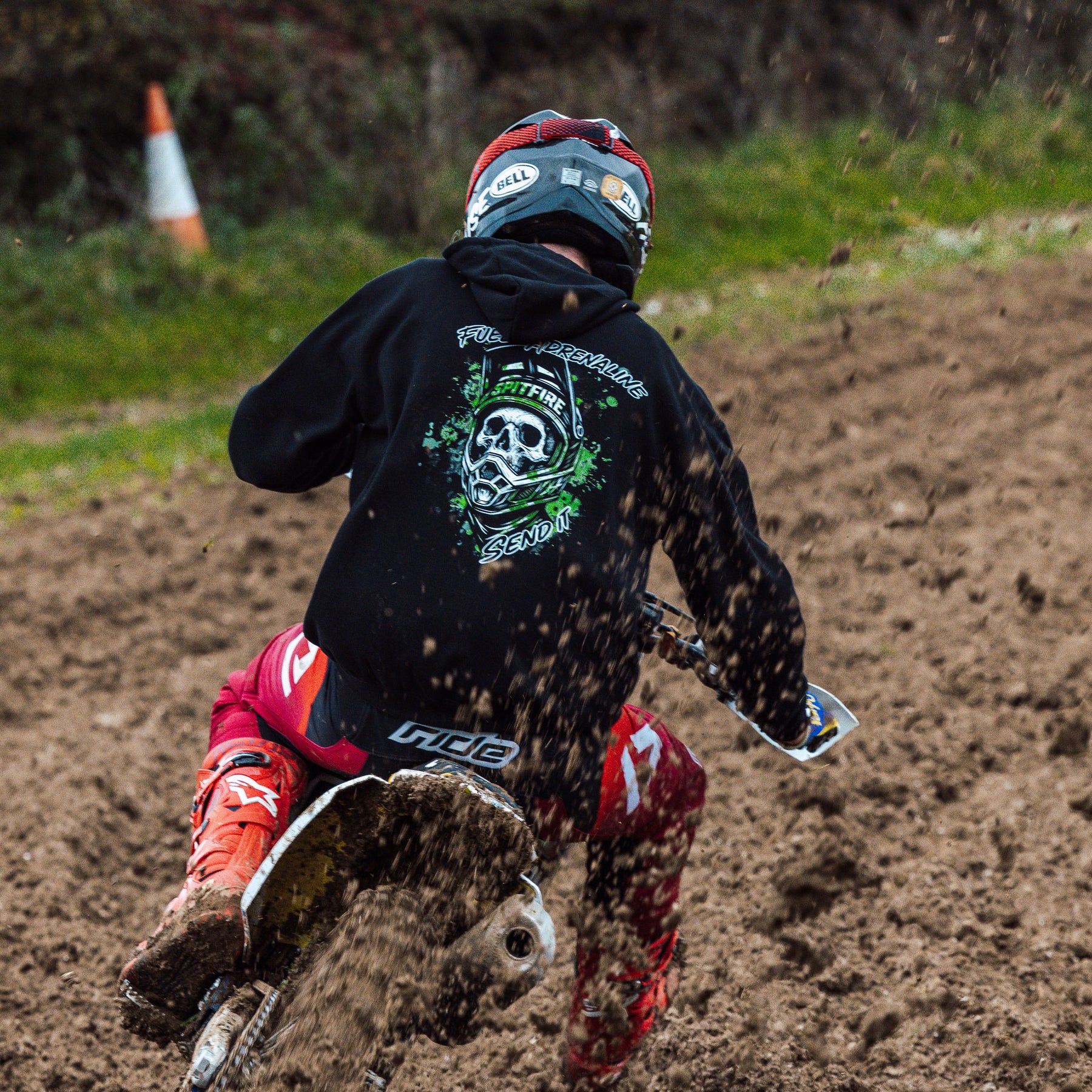 Born for the wild ones. The SEND IT hoodie is our gnarliest design yet— featuring a full face dirt helmet with the screaming skeleton design and the Fuel The Adrenaline slogan. Built for those who live for the track, send it harder, and never tone it down.