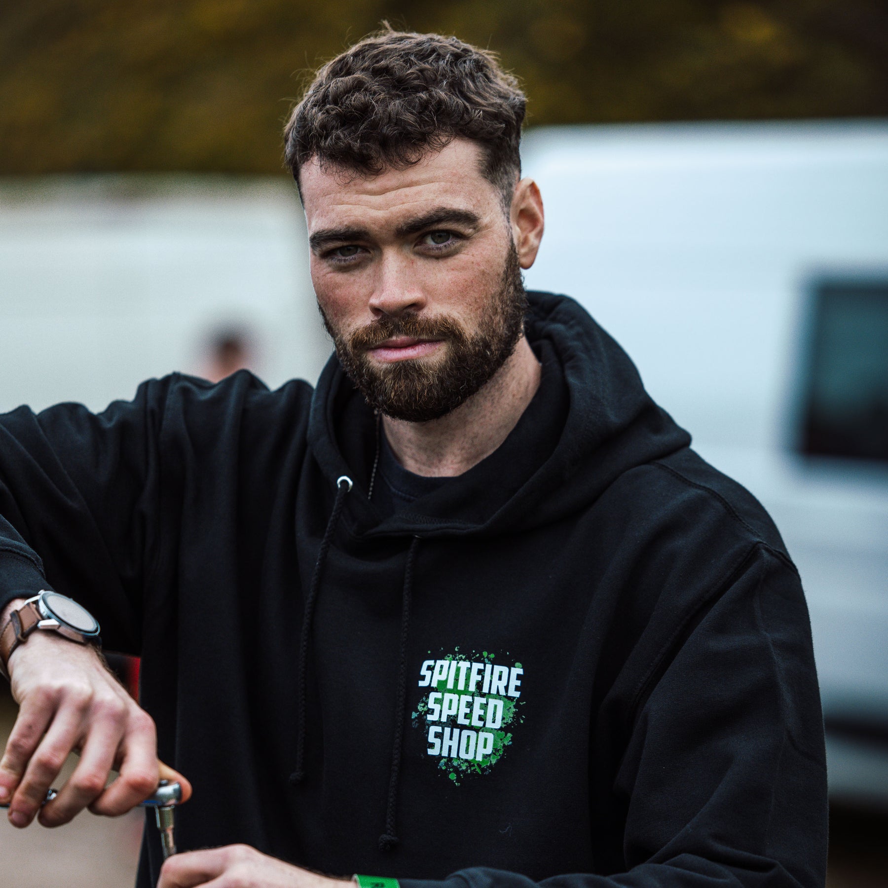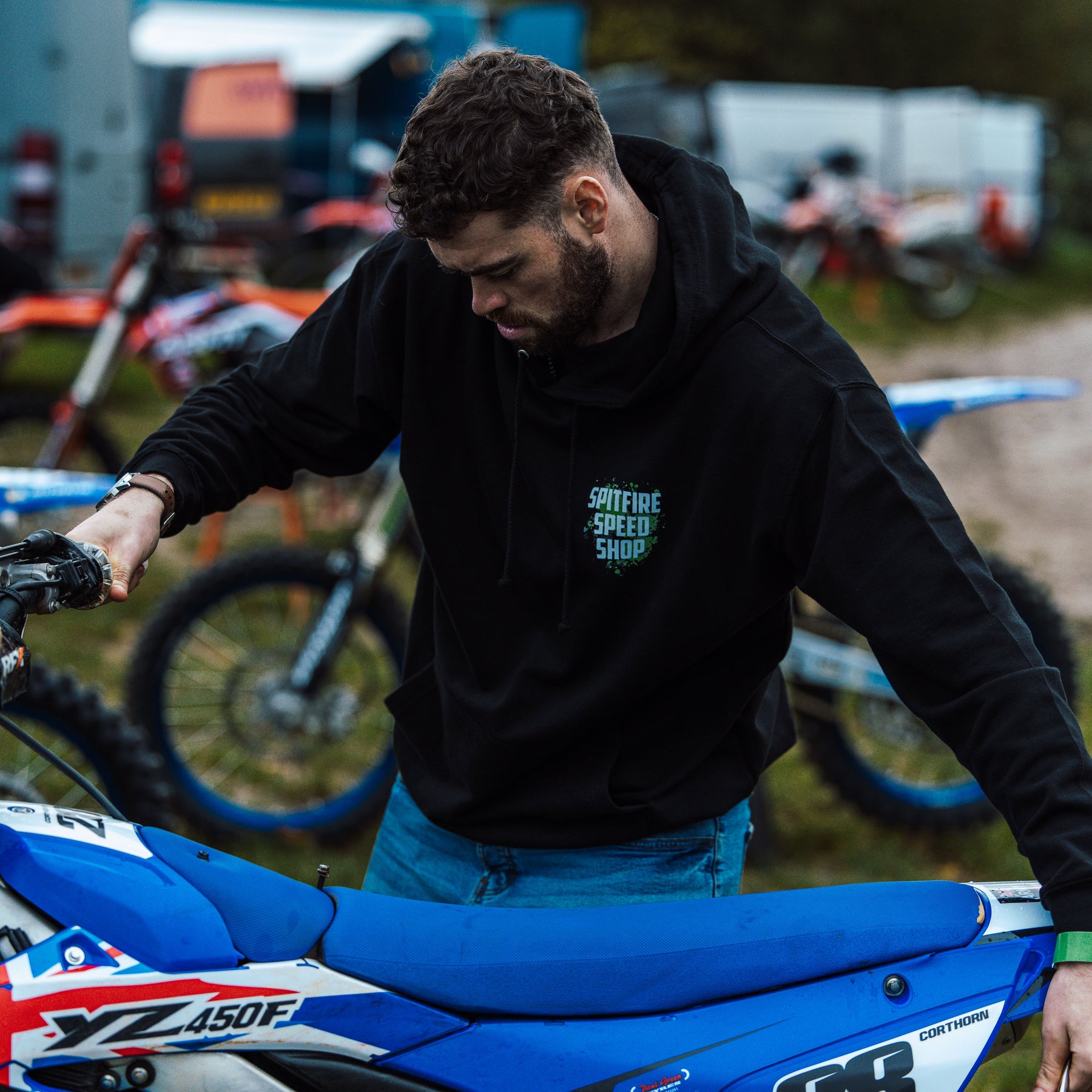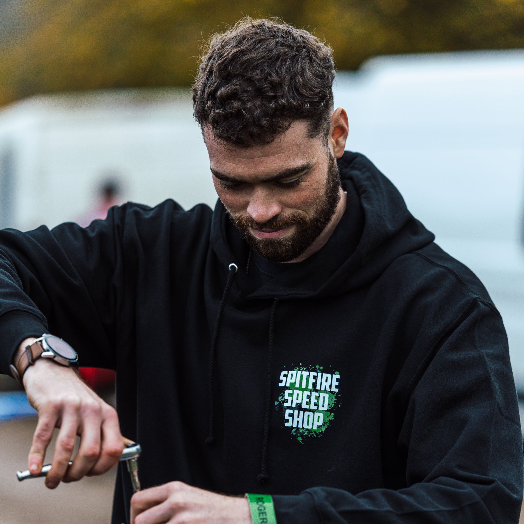 Spitfire Speed Shop – SEND IT Hoodie with green logo.