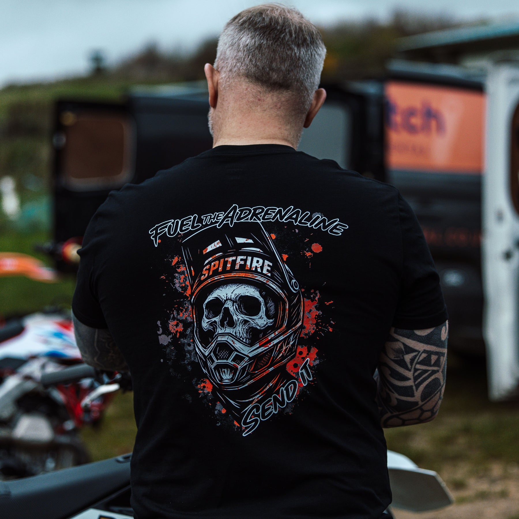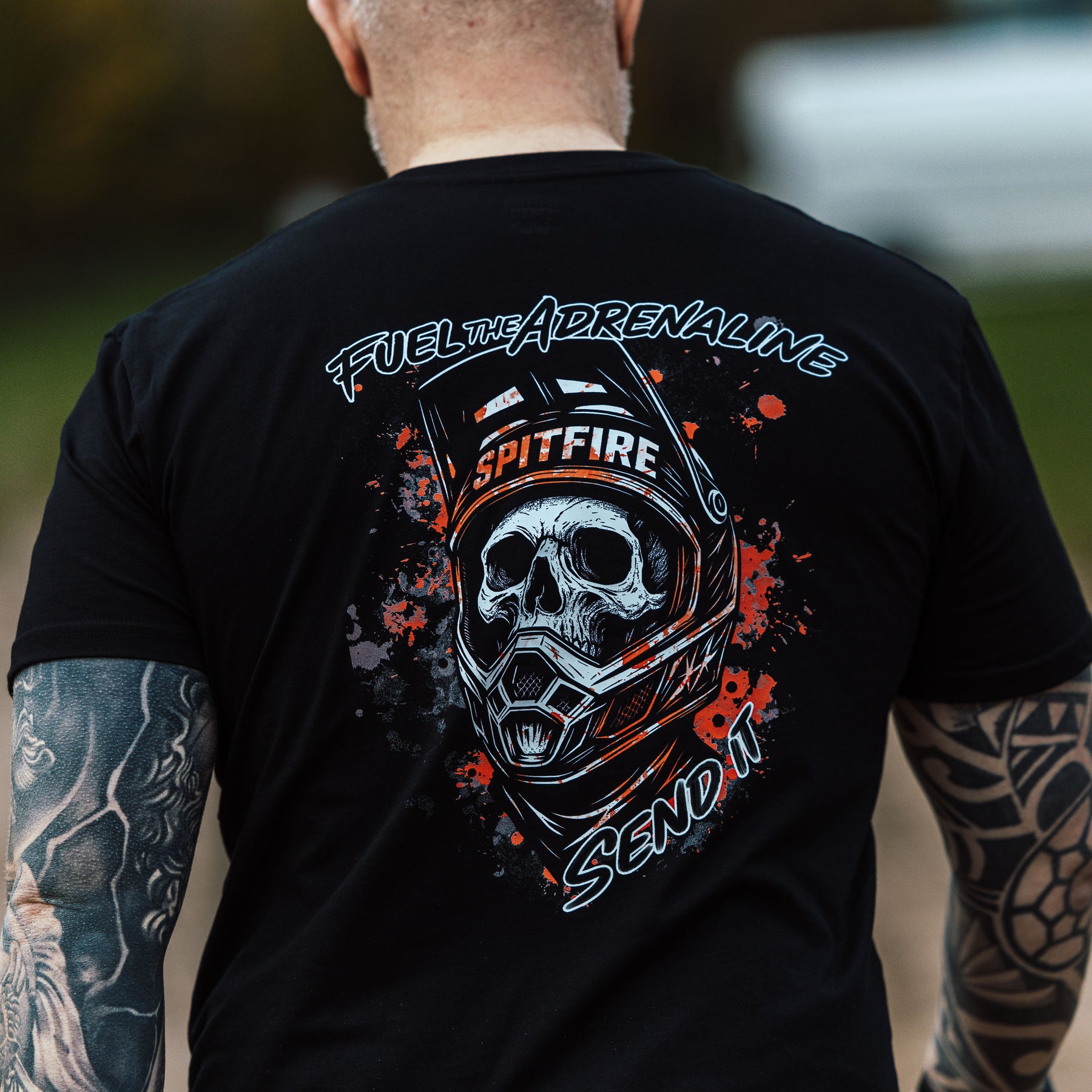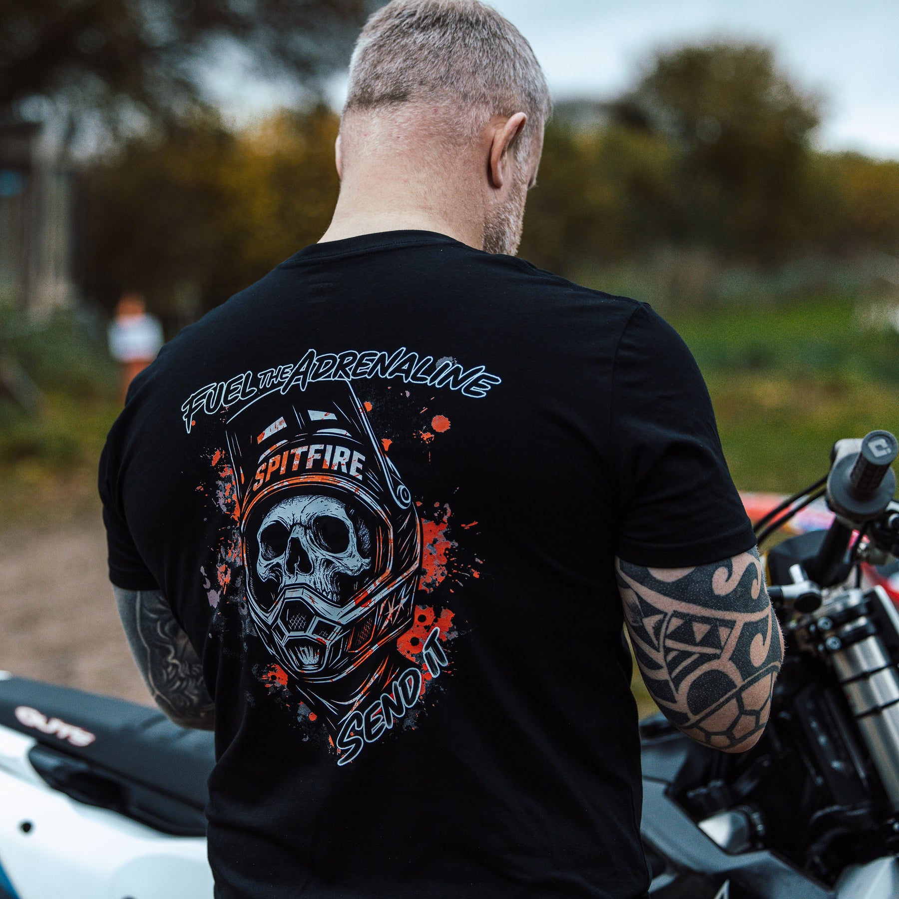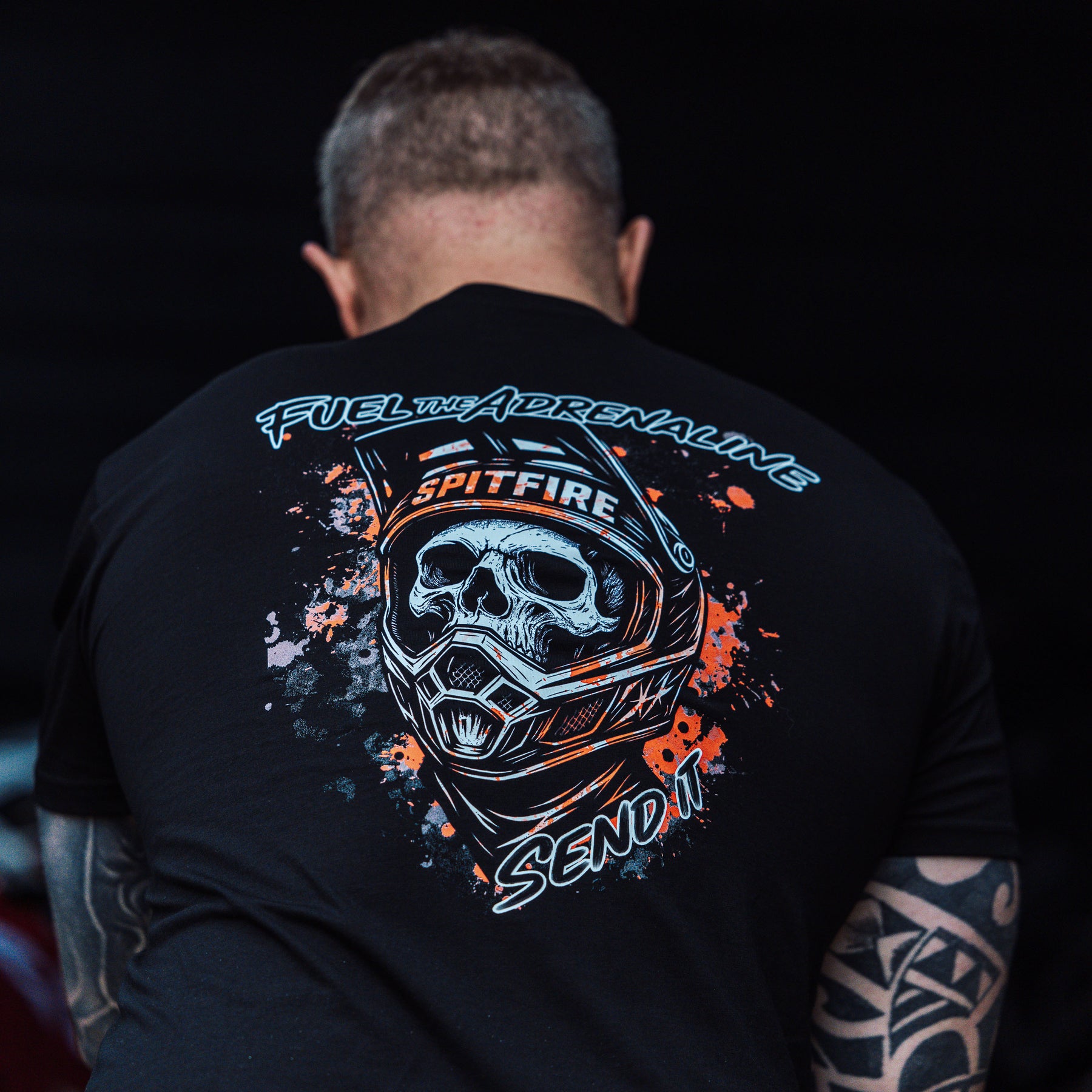 Born for the wild ones. The SEND IT T-Shirt is our gnarliest design yet— featuring a full face dirt helmet with the screaming skeleton design and the Fuel The Adrenaline slogan. Built for those who live for the track, send it harder, and never tone it down.